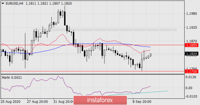 На четырёхчасовом графике цена сохраняется в обозначенном нами ранее диапазоне 1.1750-1.1855. Не сильная, но двойная конвергенция по осциллятору Марлин с выходом сигнальной линии в зону положительных значений показывает на более вероятный первичный рывок цены вверх. Конечно, он не ограничен уровнем 1.1855. Проглядывается небольшая зона накопления в районе 1.1925.