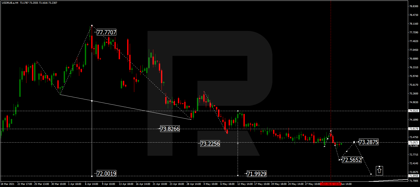 Прогноз курса валютной пары Доллар США к российскому рублю на сегодня 04.06.2021 предоставлен компанией RoboForex.