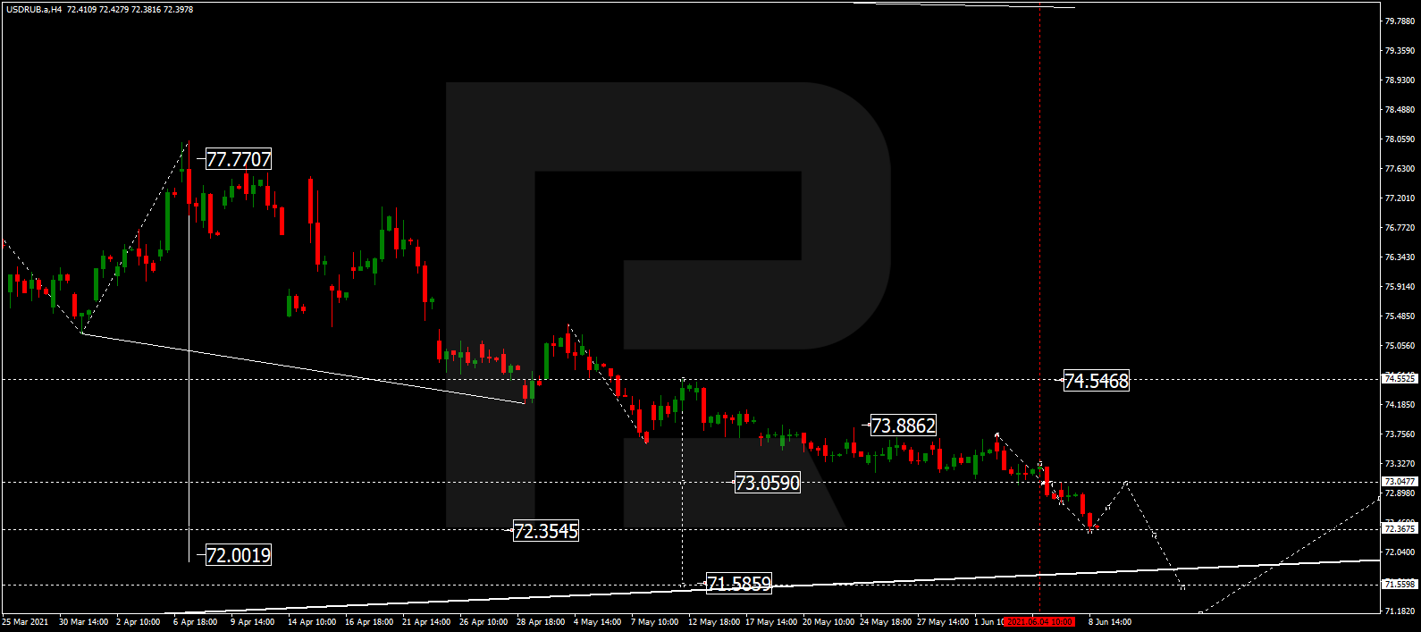 Прогноз курса валютной пары Доллар США к российскому рублю на сегодня 09.06.2021 предоставлен компанией RoboForex.