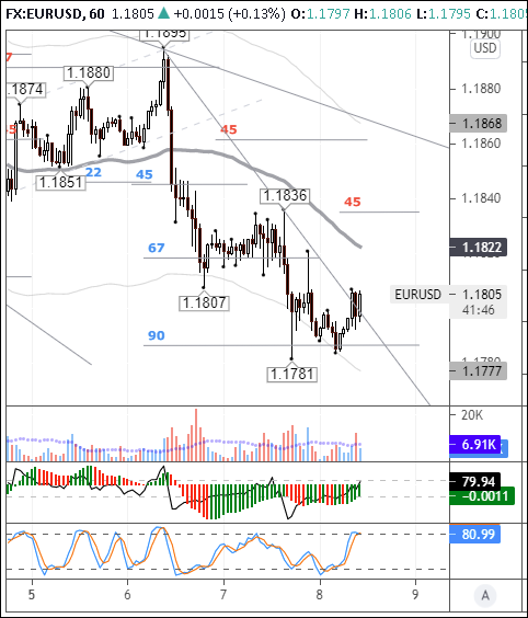 На момент написания обзора евро стоит 1,1796. Цена при отскоке остановилась на трендовой линии от вершины 1,1895. В начале европейской сессии основные валюты показывают смешанную динамику. Укрепляются йена, франк и евро. Наибольшие потери несут новозеландский (-0,65%), канадский (-0,55%) и австралийский (-0,55%) доллары. По ним сразу видно, что на рынке отсутствует склонность к риску.