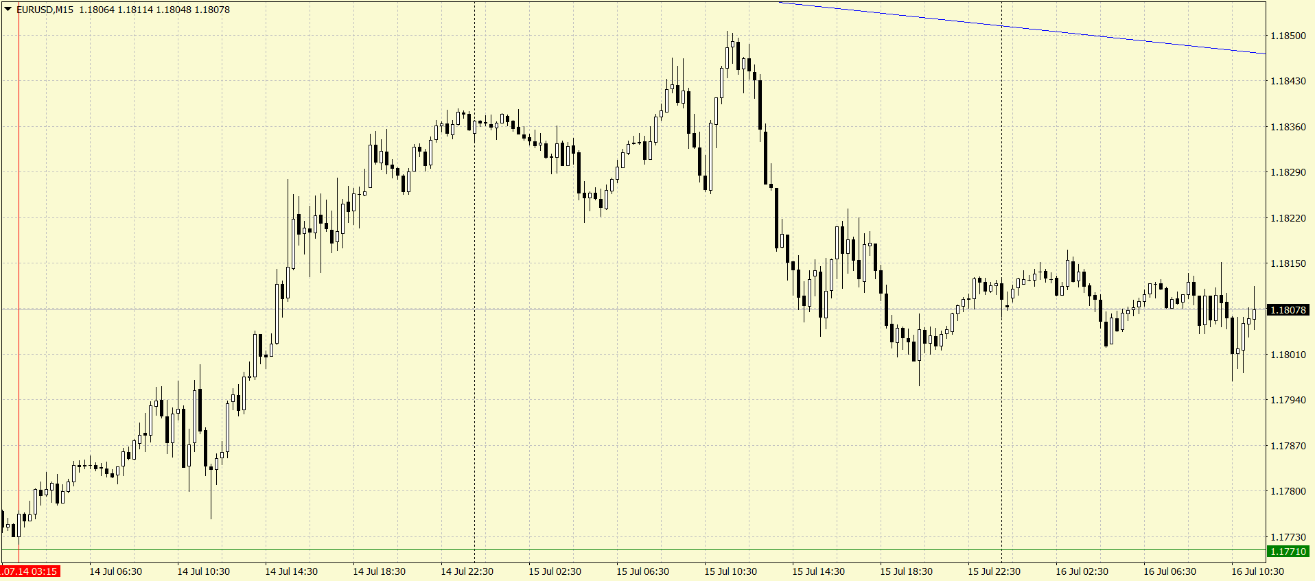 В четверг, 15 июля, валютная пара EURUSD начала торги с восстановления, но не смогла развить наступление, и завершила день снижением. Торги начались вблизи 1,1835. К полудню пара достигла 1,1850, но, развернувшись с этого уровня, отправилась вниз, опускалась вечером до 1,1795, а завершила день на отметке 1,1810.