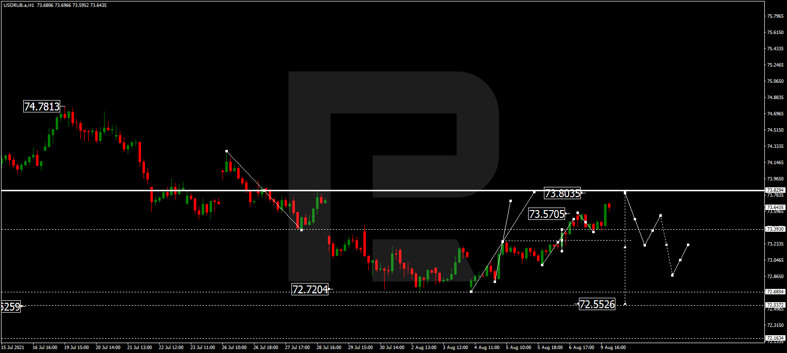 Прогноз курса валютной пары Доллар США к российскому рублю на сегодня 11.08.2021 предоставлен компанией RoboForex.