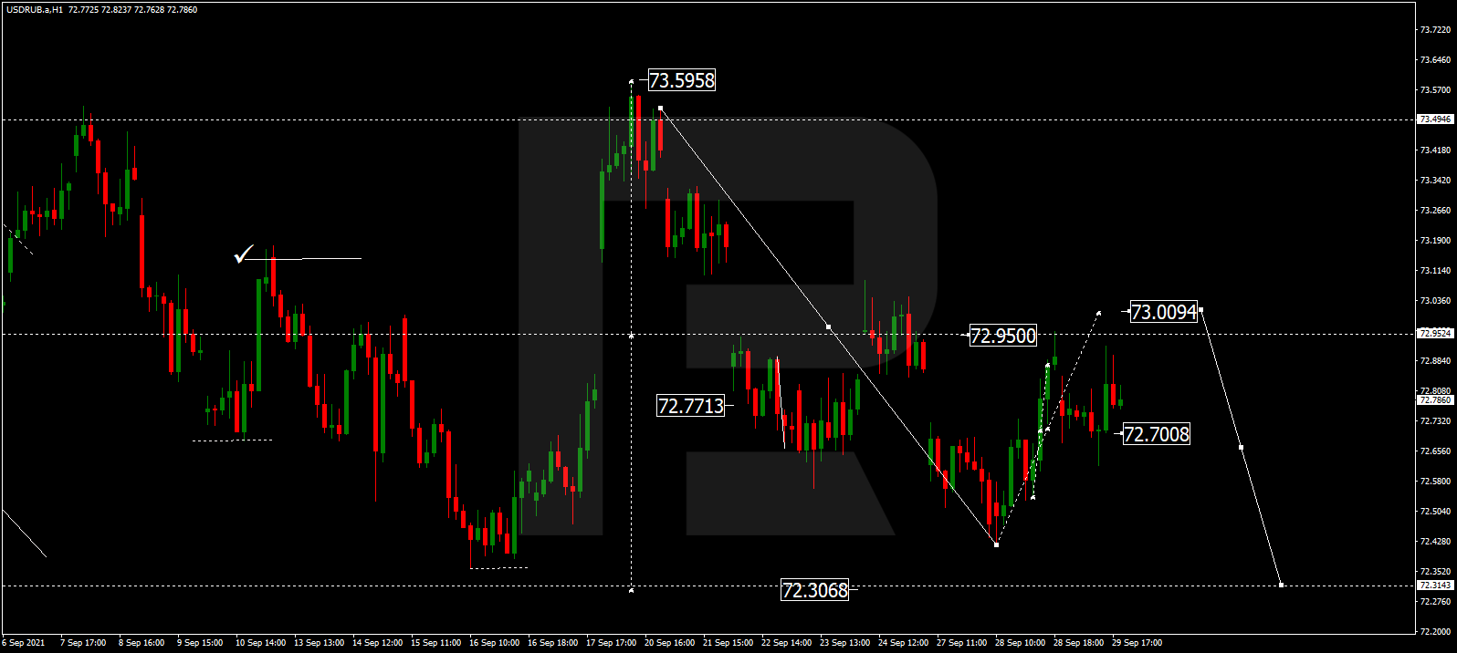 Прогноз курса валютной пары Доллар США к российскому рублю на сегодня 30.09.2021 предоставлен компанией RoboForex.