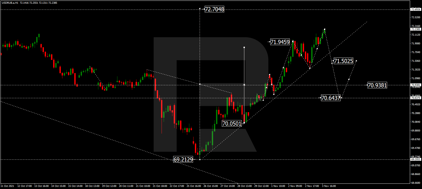 Прогноз курса валютной пары Доллар США к российскому рублю на сегодня 05.11.2021 предоставлен компанией RoboForex.