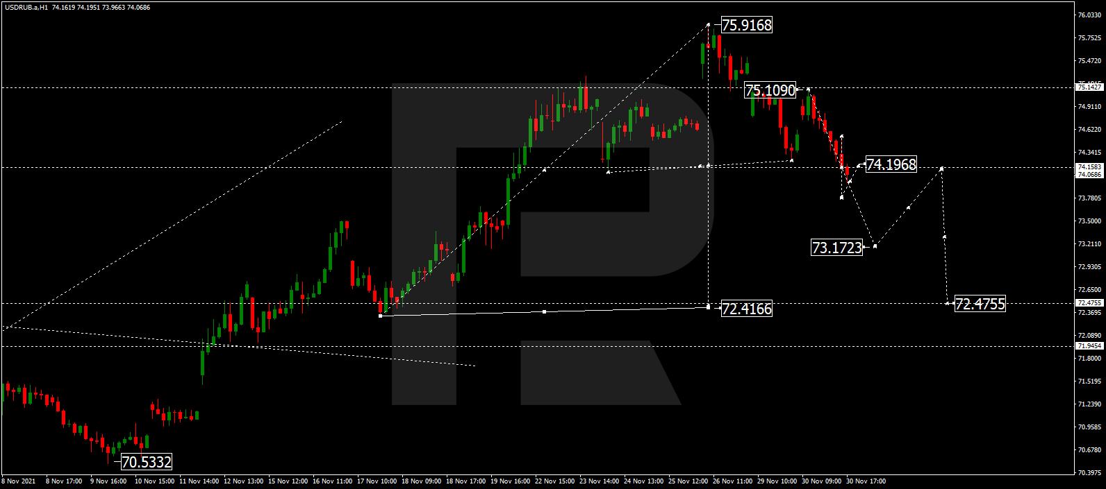 Прогноз курса валютной пары Доллар США к российскому рублю на сегодня 01.12.2021 предоставлен компанией RoboForex.