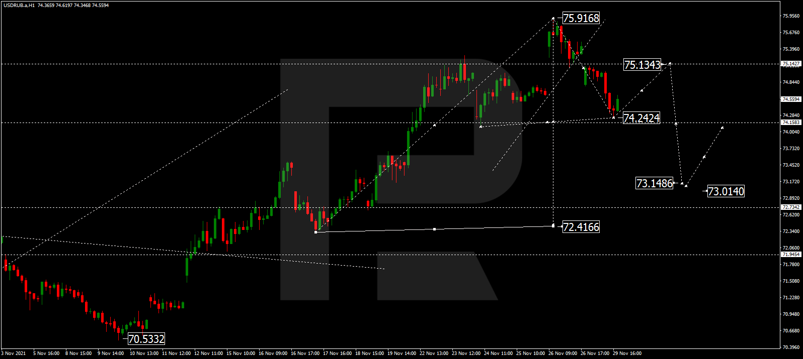 Прогноз курса валютной пары Доллар США к российскому рублю на сегодня 02.12.2021 предоставлен компанией RoboForex.