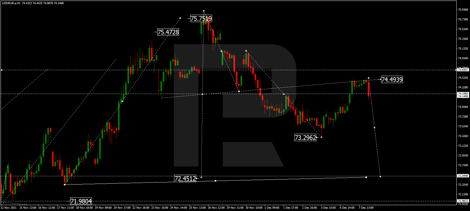 Прогноз курса валютной пары Доллар США к российскому рублю на сегодня 08.12.2021 предоставлен компанией RoboForex.